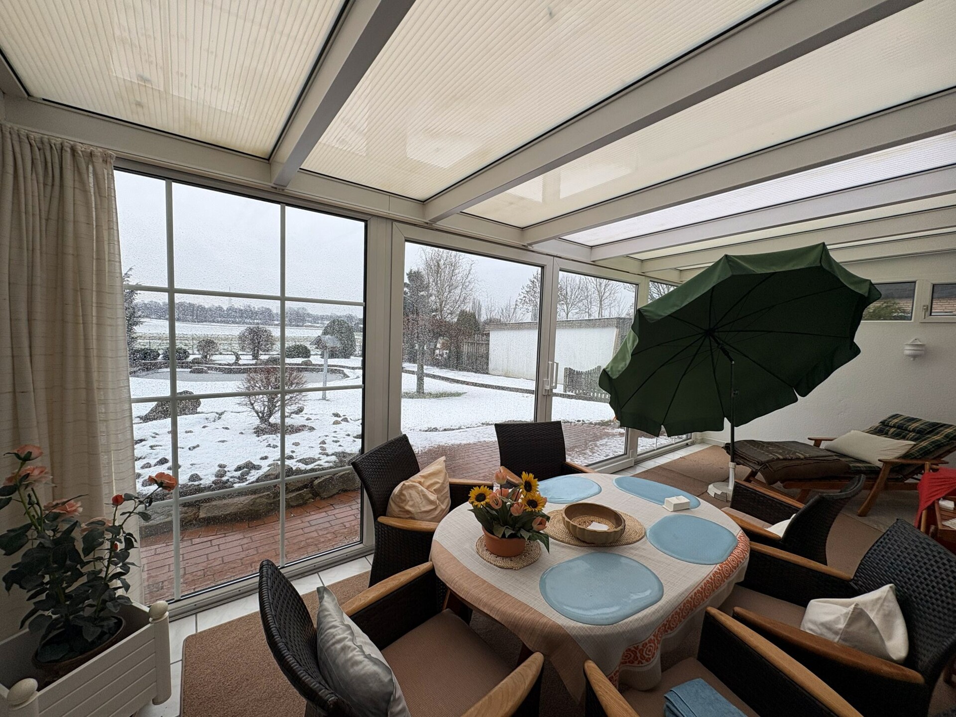 Das Erdgeschoss teilt sich wie folgt auf: Flur, Gäste-WC, Badezimmer, Schlafzimmer, Diele, Wohnzimmer, Esszimmer, Küche mit Zugang zum Wintergarten. Der Wintergarten bedarf käuferseits einer bauordnungsrechtlichen Überprüfung.