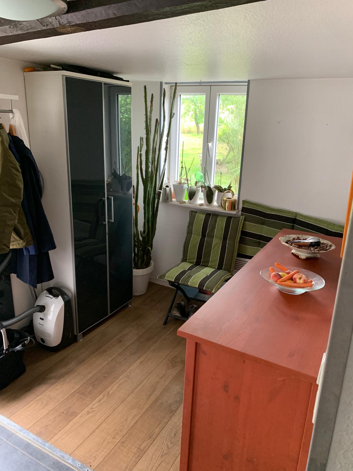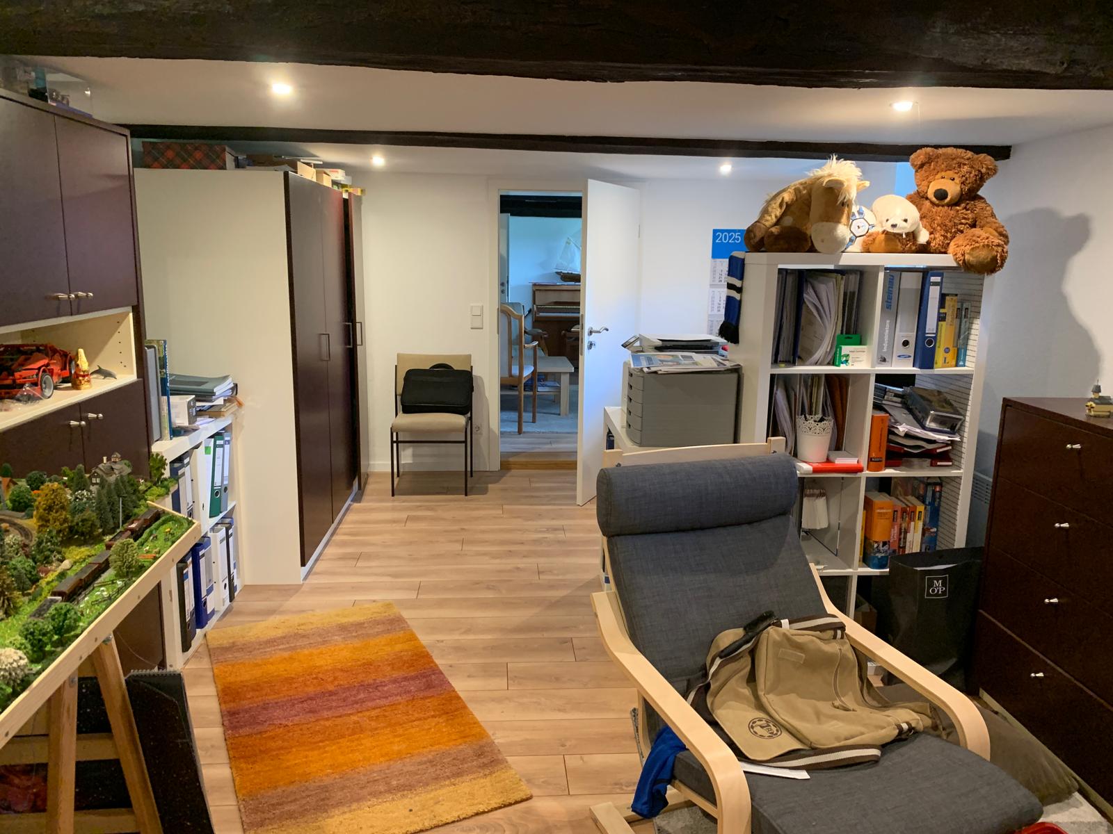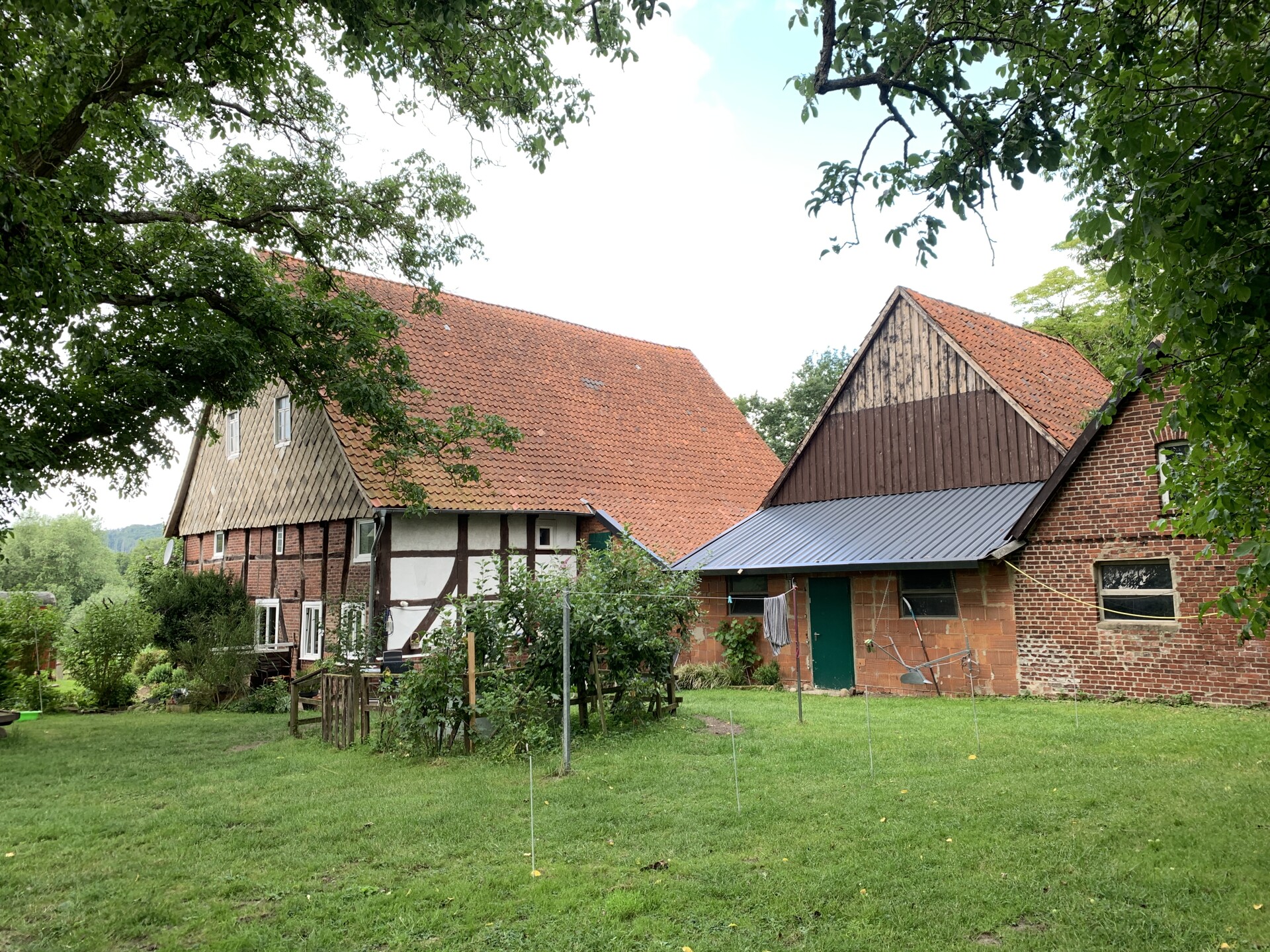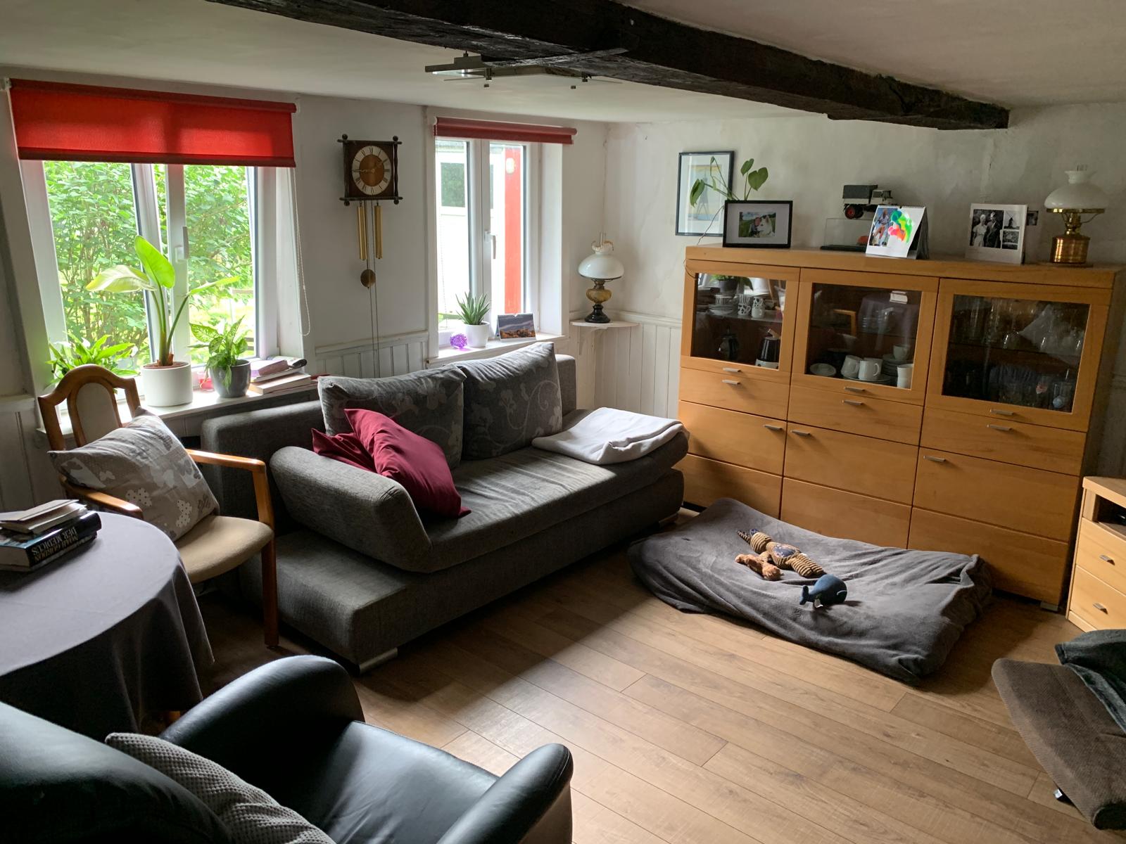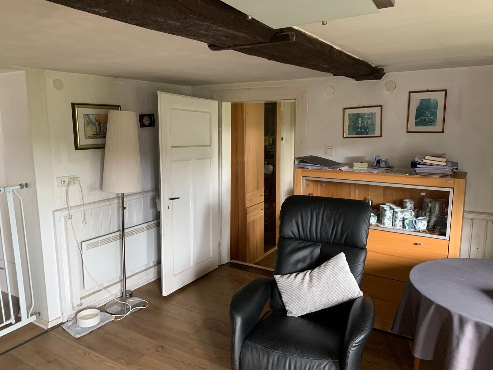Das Hauptgebäude verfügt über einen 2-geschossigen Wohnteil mit großer Deele und rund 200 m² Wohnfläche. Dabei befinden sich im Erdgeschoss das Wohnzimmer, die Küche, ein Schlafzimmer und das Bad und im Dachgeschoss 4 weitere Wohn-/Schlafräume. Es ist hier zu erwähnen, dass aufgrund der baulichen Struktur die Wohnräume eine sehr niedrige Deckenhöhe von nur rund 2 m haben. Von der Deele aus, welche über ein großrahmiges, hölzernes Deelentor auch begehbar ist, können im Erdgeschoss ein liebevoll hergerichteter Hobbyraum, die Werkstatt, 2 Kellerräume und ein noch zu modernisierendes WC erreicht werden. Ebenso sind die Schlafzimmer im Obergeschoss über die Deele und eine Holztreppe zu erreichen.