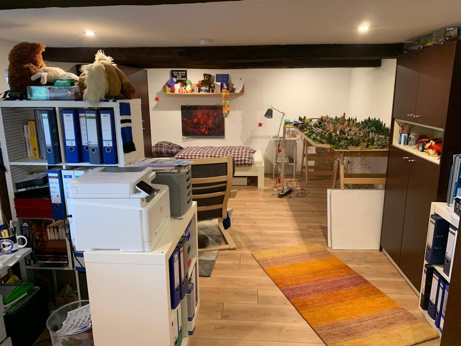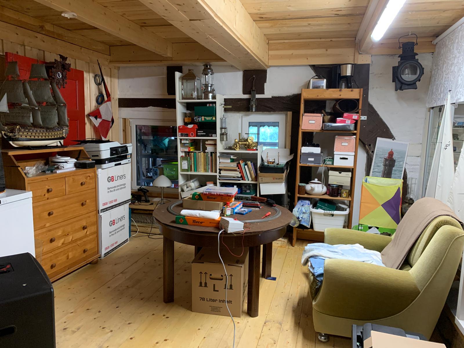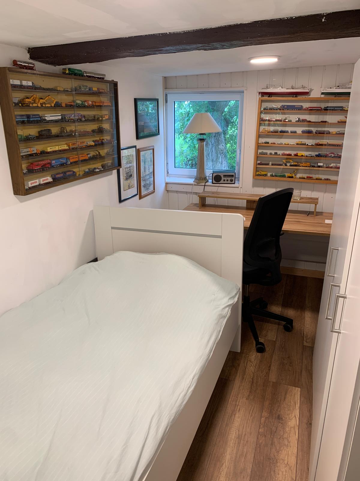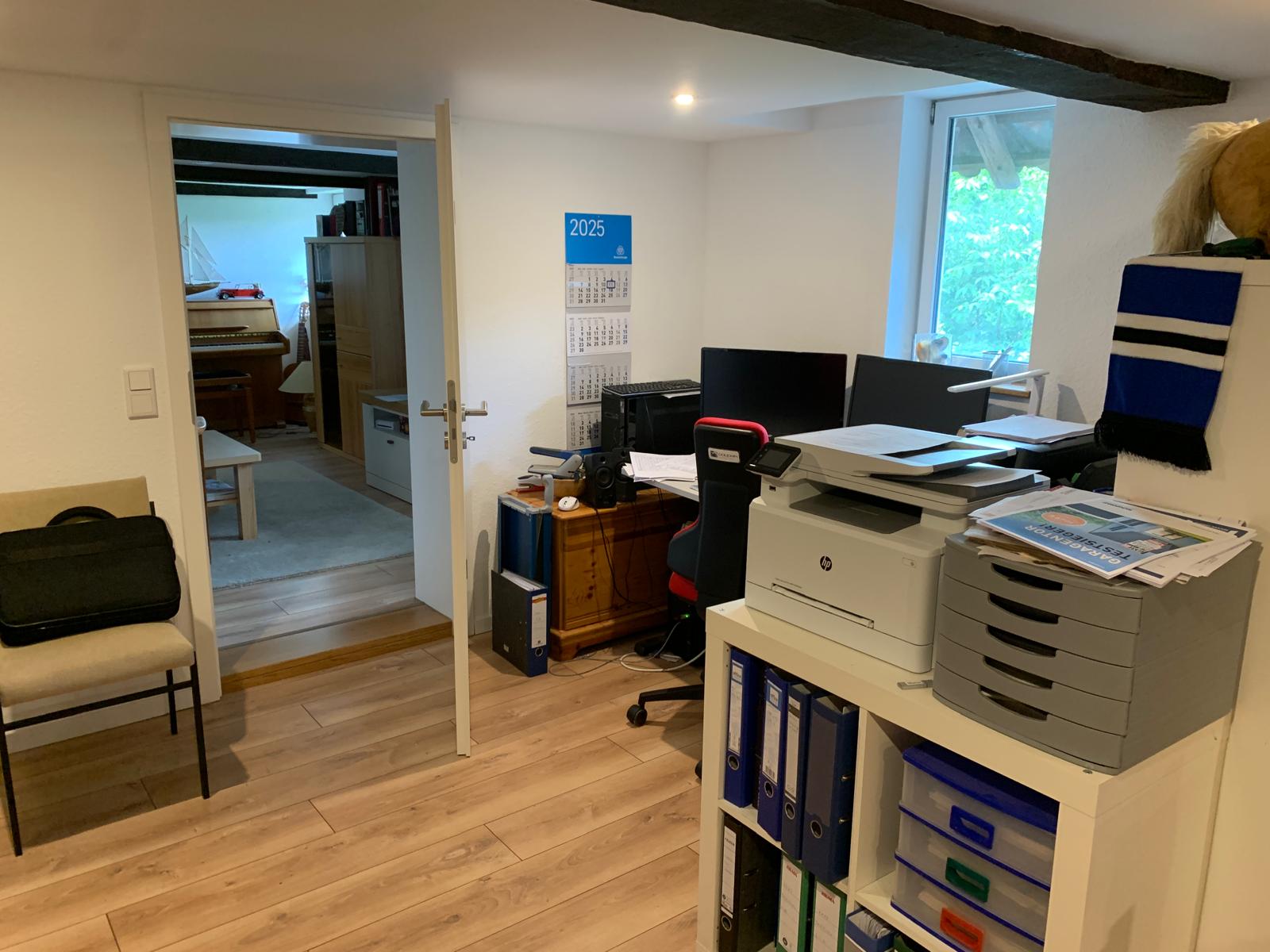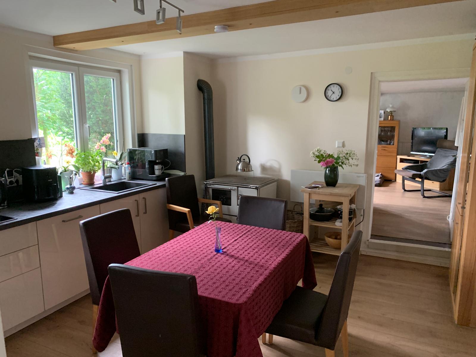 Das Hauptgebäude verfügt über einen 2-geschossigen Wohnteil mit großer Deele und rund 200 m² Wohnfläche. Dabei befinden sich im Erdgeschoss das Wohnzimmer, die Küche, ein Schlafzimmer und das Bad und im Dachgeschoss 4 weitere Wohn-/Schlafräume. Es ist hier zu erwähnen, dass aufgrund der baulichen Struktur die Wohnräume eine sehr niedrige Deckenhöhe von nur rund 2 m haben. Von der Deele aus, welche über ein großrahmiges, hölzernes Deelentor auch begehbar ist, können im Erdgeschoss ein liebevoll hergerichteter Hobbyraum, die Werkstatt, 2 Kellerräume und ein noch zu modernisierendes WC erreicht werden. Ebenso sind die Schlafzimmer im Obergeschoss über die Deele und eine Holztreppe zu erreichen.