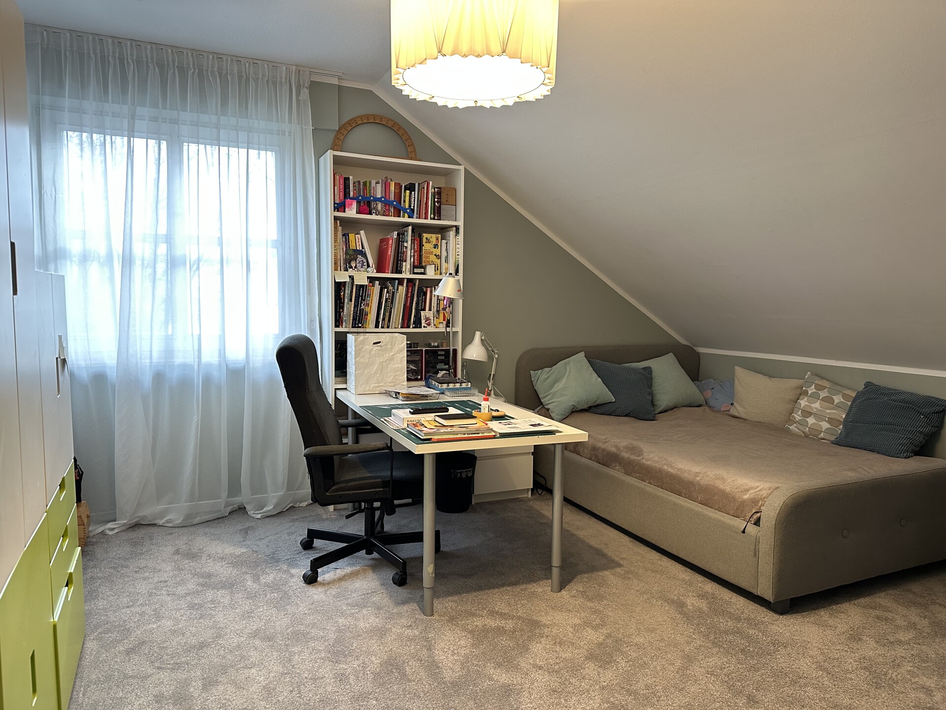 Die Immobilie teilt sich wie folgt auf: Erdgeschoss – Hauseingang, Diele, mit Garderobe und Gäste-WC, eine Küche sowie das geräumige Wohn-/Esszimmer mit Zugang zum großzügigen Garten mit Terrasse und Zierteich, Flur mit Durchgang zur Gewerbeeinheit. Im Dachgeschoss befinden sich 2 geräumige Kinderzimmer, ein Schlafzimmer mit Ankleide und Zugang zur Loggia sowie ein Büro, Badezimmer und Gäste-WC.