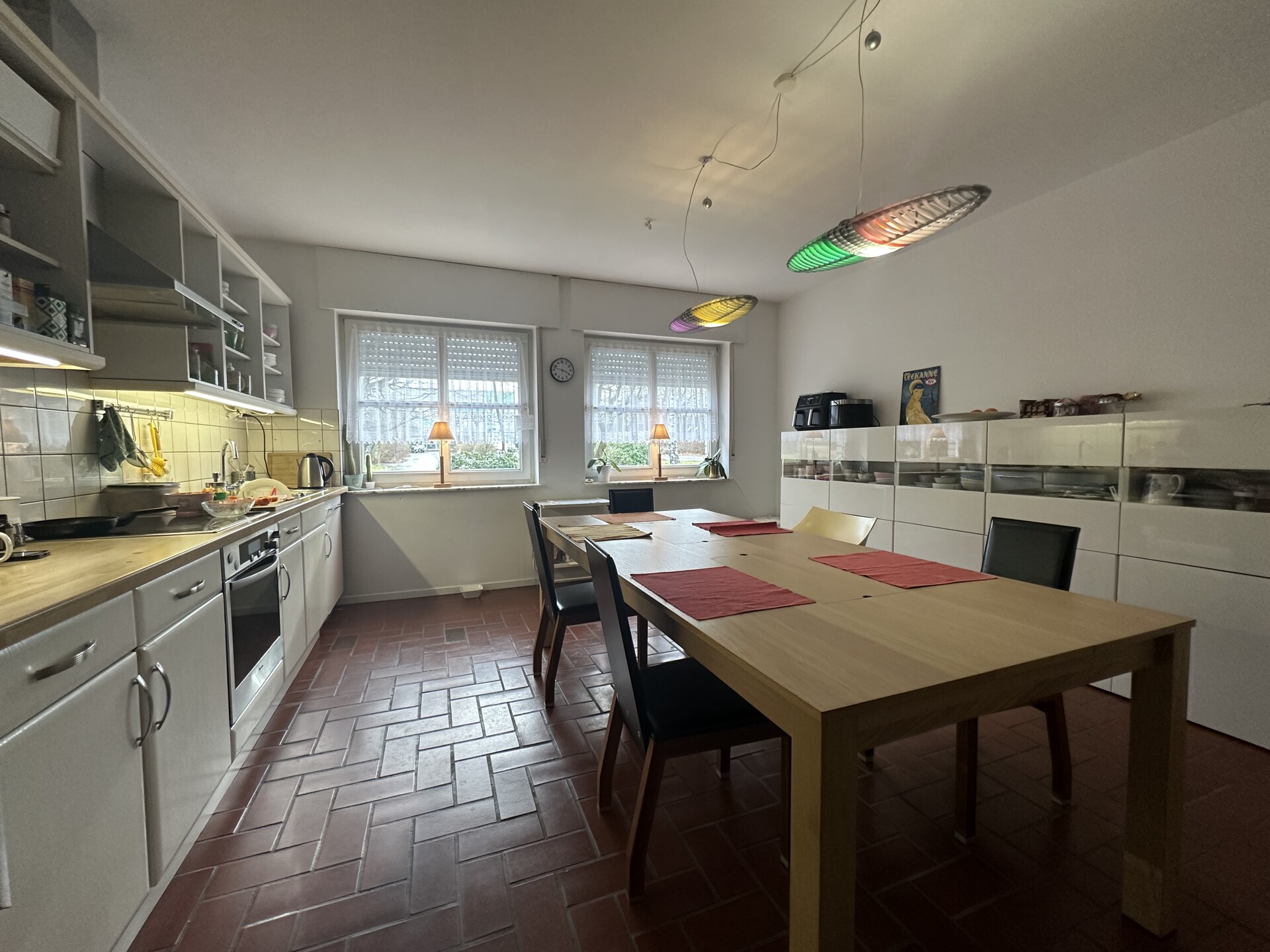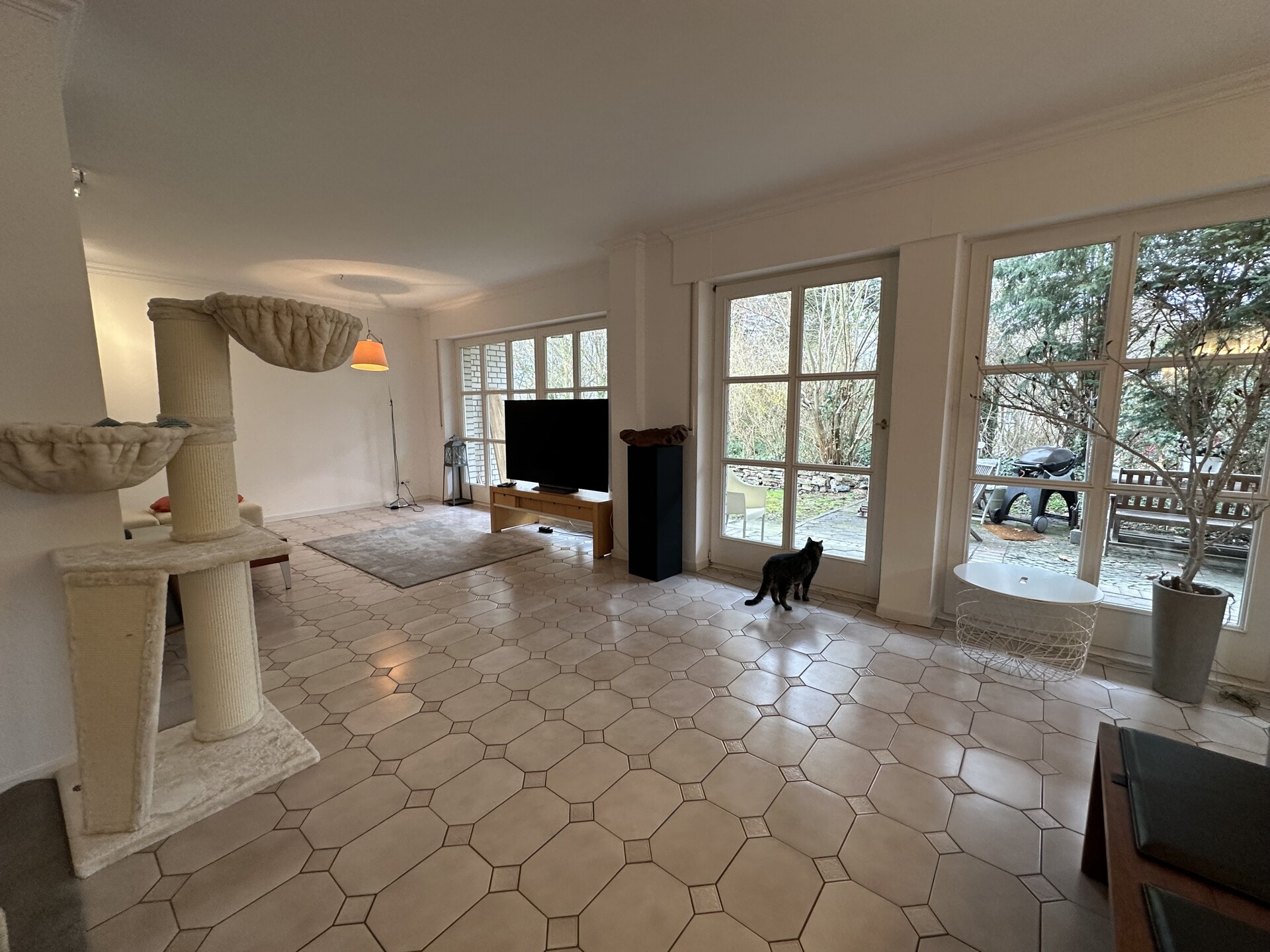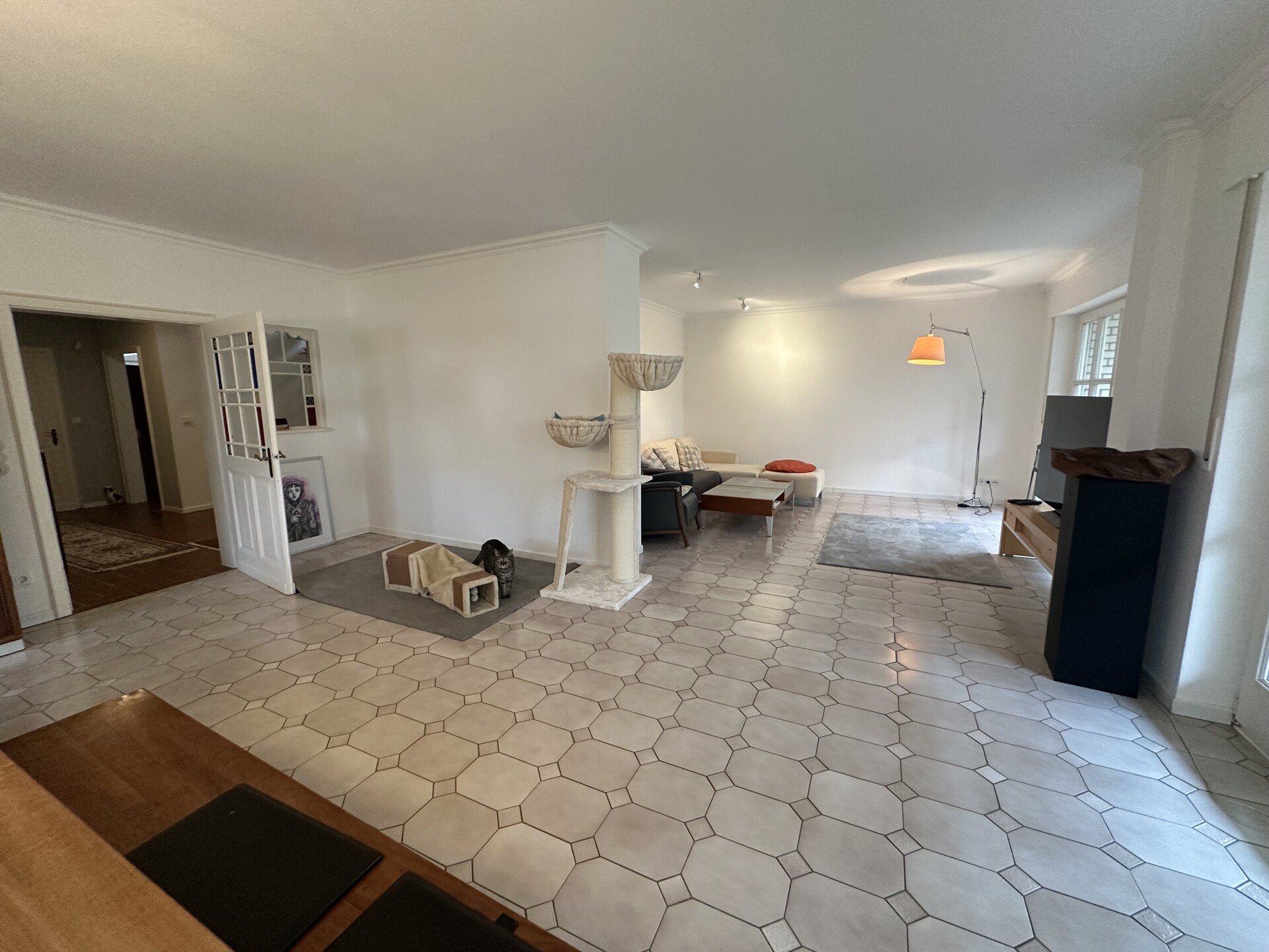 Die Wohnfläche von ca. 214 m² verteilt sich auf zwei Etagen und umfasst insgesamt 6 Zimmer, darunter 3 Schlafzimmer. Ein Badezimmer sowie drei separate Gäste-WC sorgen für einen angenehmen Wohnkomfort im Alltag. Ergänzend stehen eine Terrasse und eine Loggia zur Verfügung, die zum Entspannen im Grünen einladen.