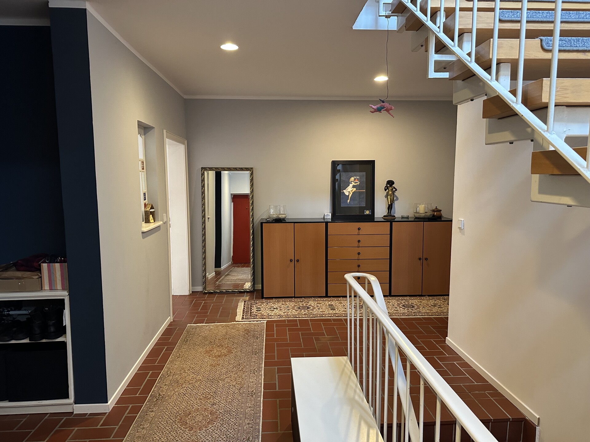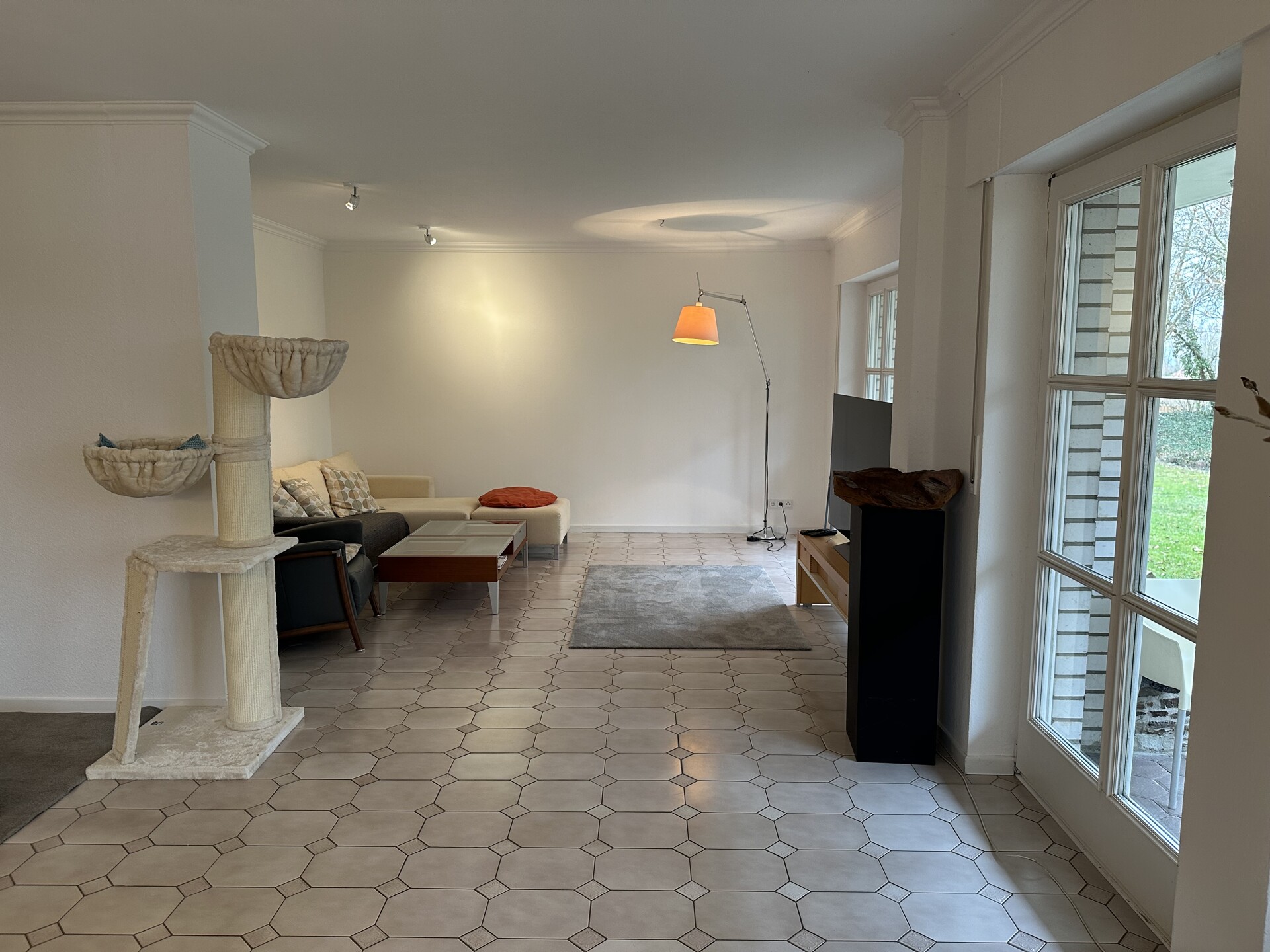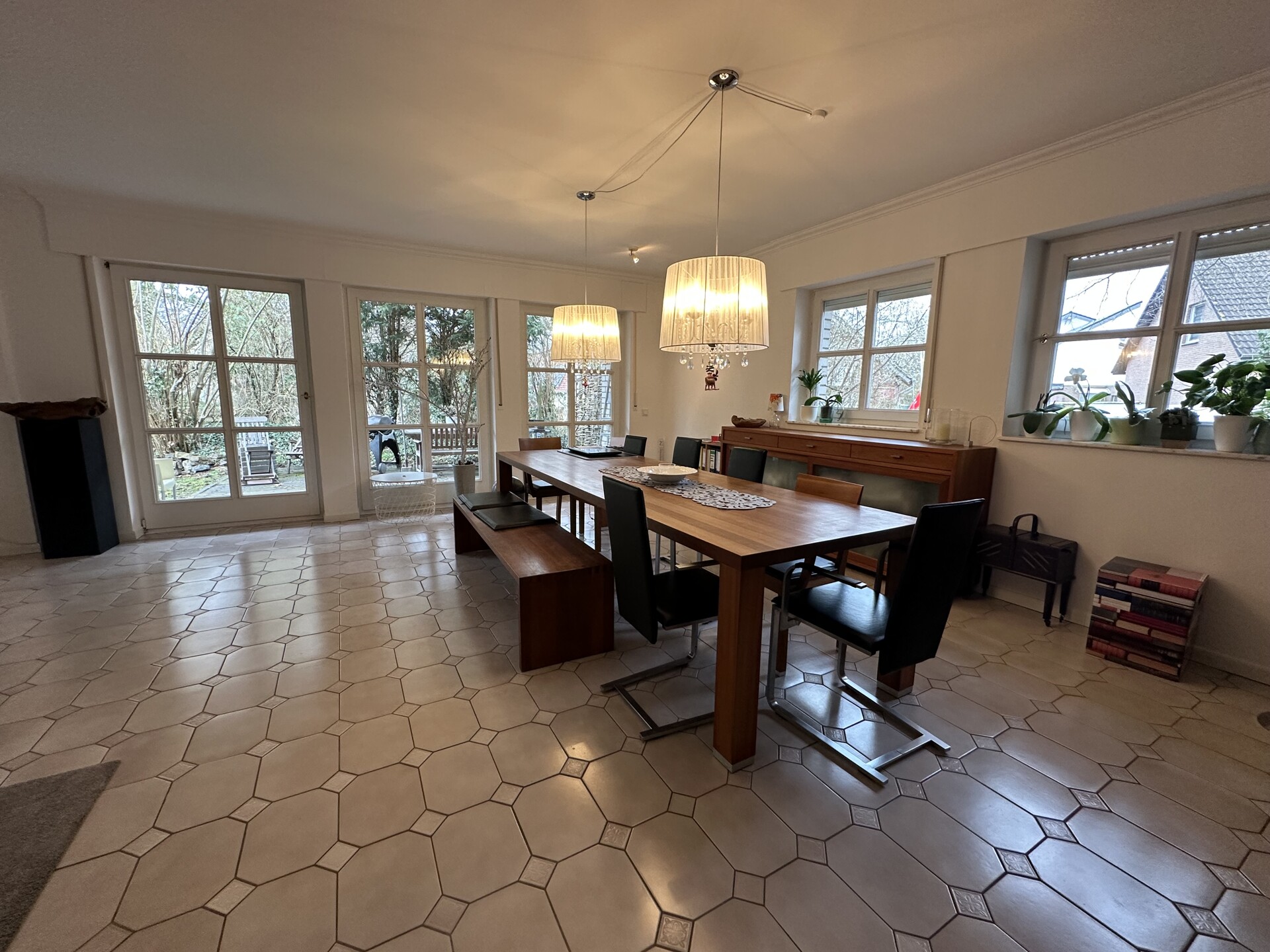 Die Wohnfläche von ca. 214 m² verteilt sich auf zwei Etagen und umfasst insgesamt 6 Zimmer, darunter 3 Schlafzimmer. Ein Badezimmer sowie drei separate Gäste-WC sorgen für einen angenehmen Wohnkomfort im Alltag. Ergänzend stehen eine Terrasse und eine Loggia zur Verfügung, die zum Entspannen im Grünen einladen.