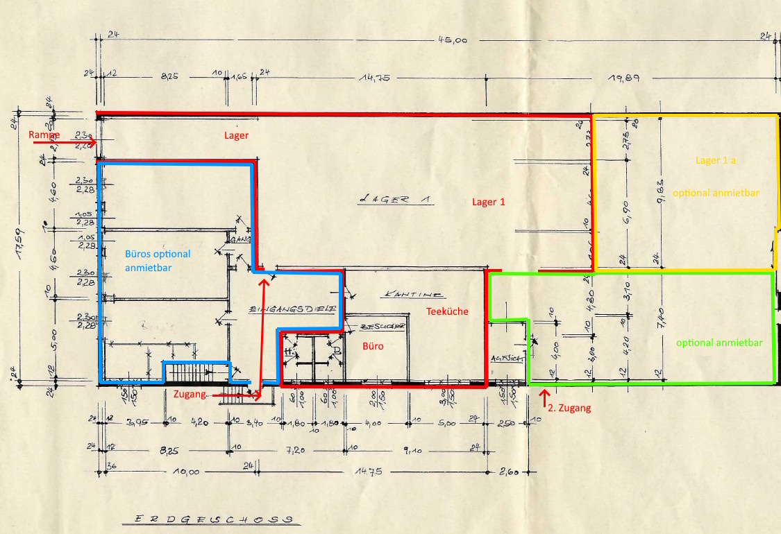 Die Halle von ca. 213 m² Nutzfläche (ca. 5 m Hallenhöhe im höchsten Bereich) befindet sich in einem ordentlichen Zustand, wurde in Stahlskelett-Bauweise mit Pultdach erstellt und verfügt über einen Estrich-Boden sowie 1 Hallentor, durch das Waren auf Palette bequem mit Gabelstapler oder Hubwagen hindurchbewegt werden können. Zur Anlieferung steht eine LKW-Laderampe zur Verfügung (Rolltorhöhe ca. 2,50 m). Beleuchtung und Stromanschlüsse stehen dem Mieter in der Fläche zur Verfügung. In der Fläche ist eine Empore aus Holz eingebaut, sodass weiterer Lagerraum auf einem Zwischenboden zur Verfügung steht. Die Halle verfügt zudem über einige Schwerlastregale, die von einem neuen Mieter unentgeltlich übernommen werden können. Ein Büroraum (ca. 16 m²), ein geräumiger Aufenthaltsraum von ca. 48 m² (Sozialraum mit Einbauküche, der auch als Büro genutzt werden kann) und ein WC (ca. 5,2 m²) gehören zu diesem Mietangebot. Ihre PKWs können bequem vor dem Objekt abgestellt werden. Auf Wunsch können weitere ca. 180 m² Lagerfläche und 3 zusätzliche Großraum-Büros von insg. ca. 164 m², sowie ein weiterer Hallentrakt mit ca. 695 m² im gleichen Gebäude gegen zusätzliche Gebühr mit angemietet werden! Der Mietpreis für diese Zusatzflächen wäre noch mit dem Eigentümer zu verhandeln!