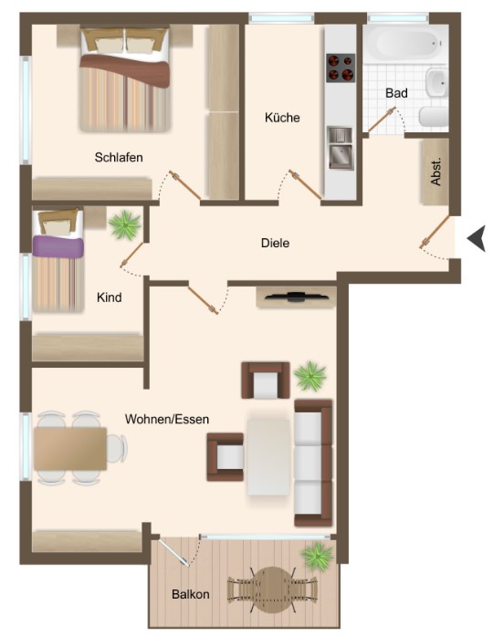 Die Wohnung teilt sich wie folgt auf: Flur, Bad mit Dusche und Fenster, Abstellraum, Kinder-/Arbeitszimmer, Schlafzimmer, Küche inklusive Einbauküche, Wohn-/Esszimmer mit Zugang auf den Südbalkon, ausgestattet mit einer Markise.